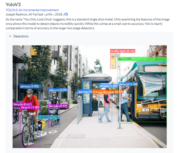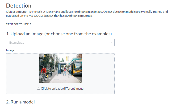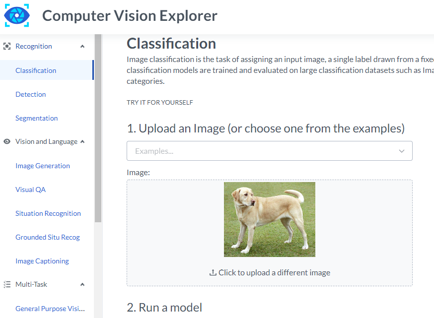 The AI2 Computer Vision Explorer offers demos of a variety of popular models - try, compare, and evaluate with your own images!