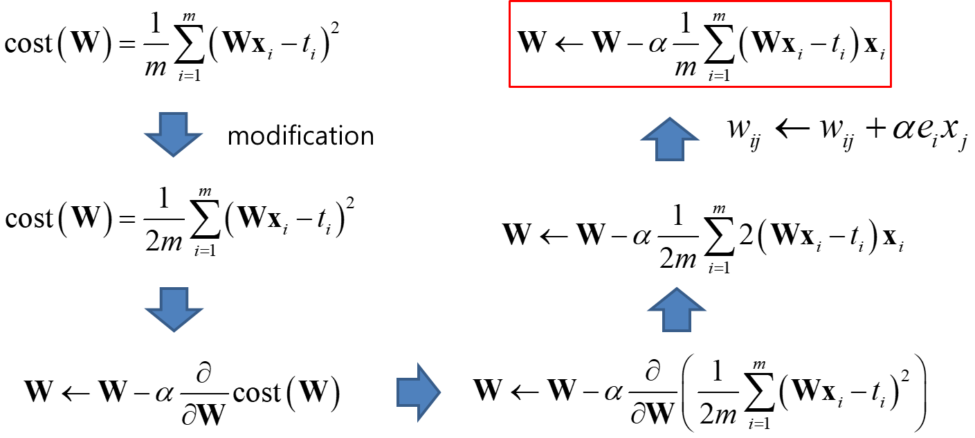 cost (W,b) = 에러 e (결과y값에서 타겟값 t를 빼줌)의 제곱의 평균 : Mean Square Error