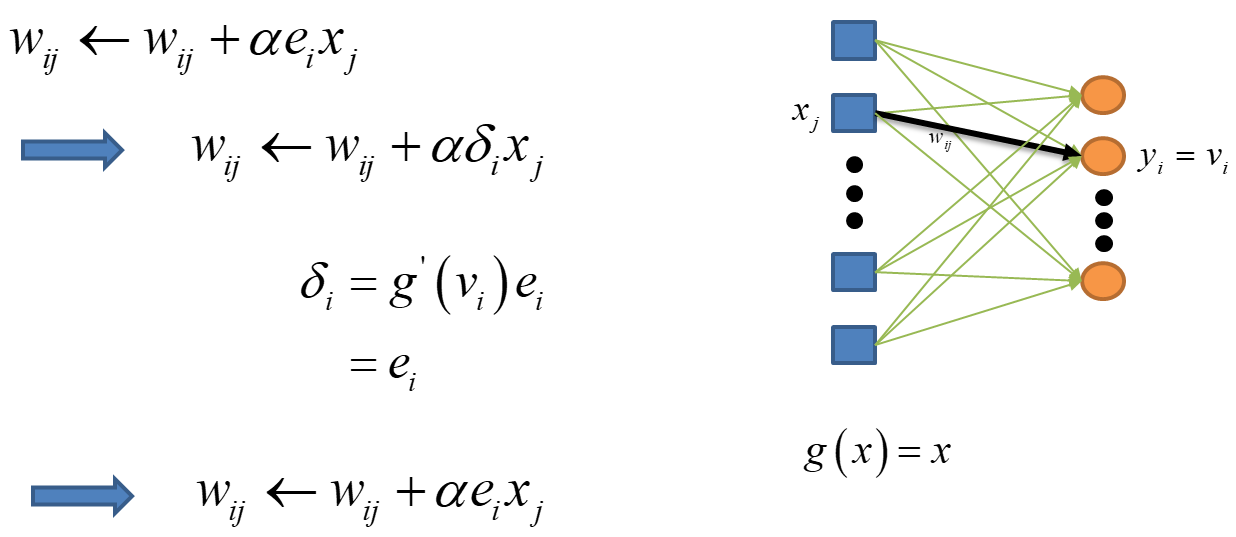 어떤 입력 노드가 출력 노드의 오차에 기여했다면, 두 노드 사이의 가중치(weight)를 입력 노드의 입력과 오차에 비례하여 조절, 웨이트는 입력데이터에 대한 오차에 비례하여 조절